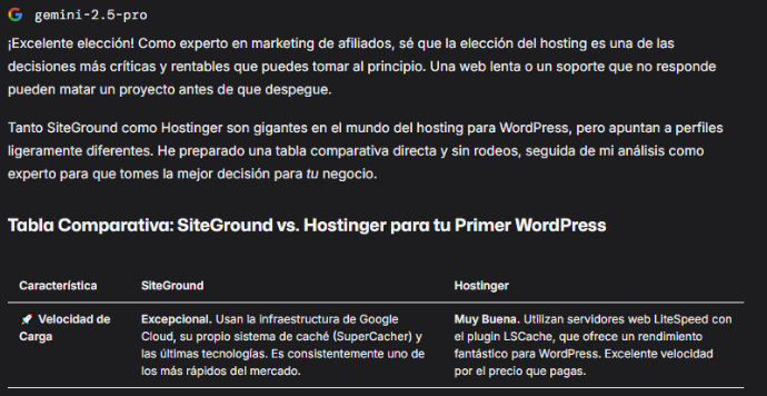 "Actuá como un experto en marketing de afiliados. Creame una tabla comparativa entre SiteGround y Hostinger. Enfocate en estos puntos: velocidad de carga, soporte técnico para principiantes, precio del primer año y facilidad de uso para alguien que monta su primer WordPress. Agregá una columna con 'Ideal para...' y definí el perfil de usuario para cada uno."