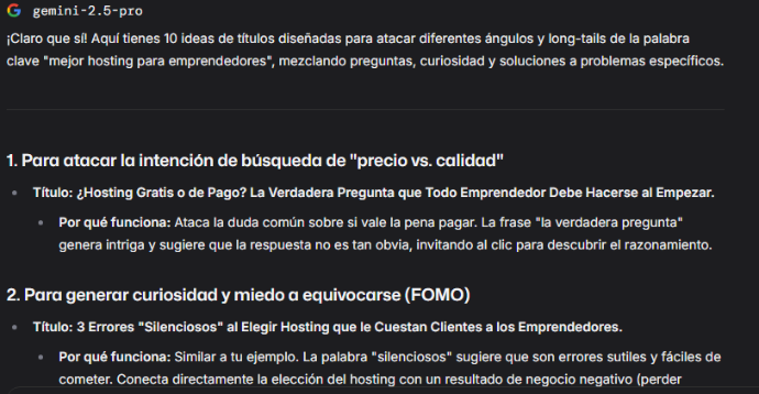 "Mi palabra clave principal es 'mejor hosting para emprendedores'. Dame 10 ideas de títulos para un post de blog que ataquen intenciones de búsqueda secundarias. Incluí preguntas comunes (long-tail keywords) y títulos que generen curiosidad. Por ejemplo, 'El error que el 90% de los emprendedores comete al elegir un hosting'."